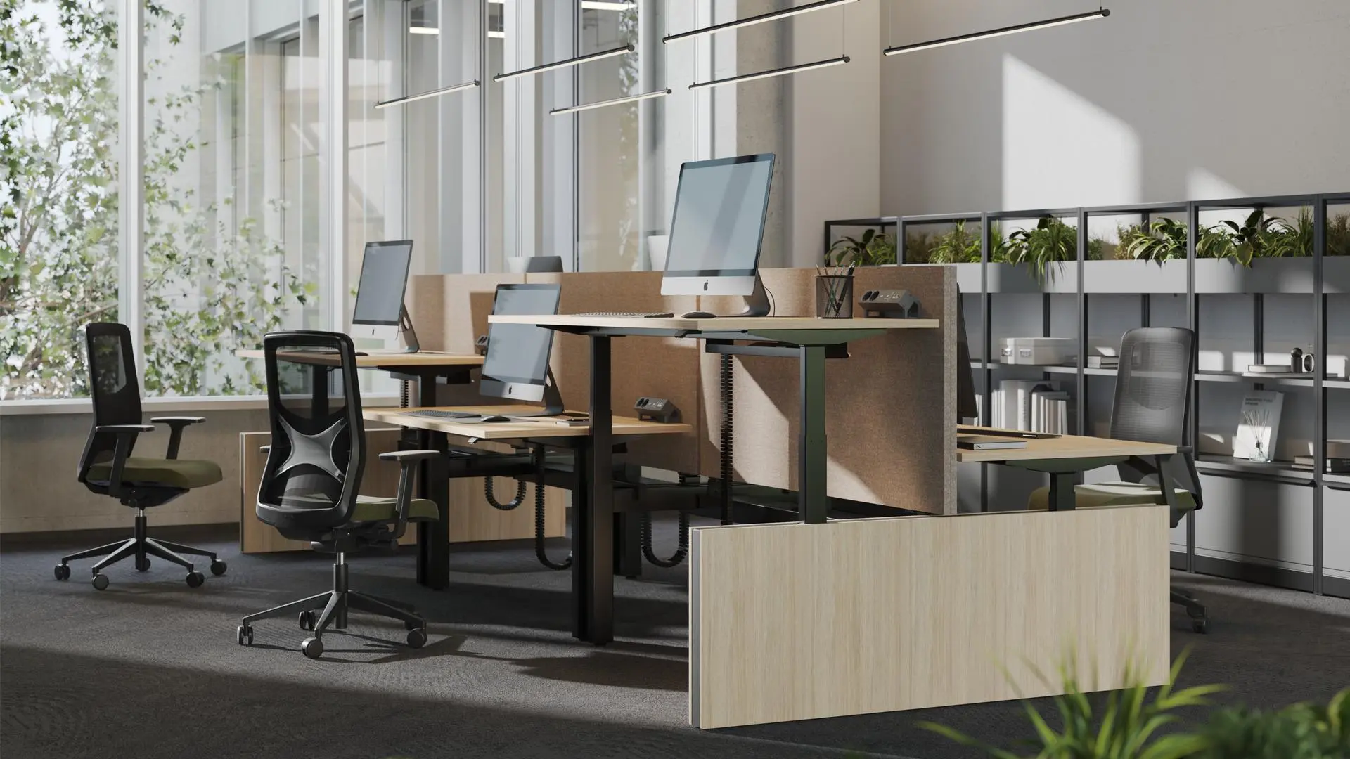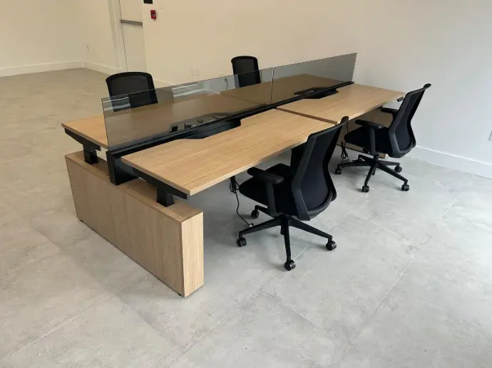 Combines the openness of bench systems with the flexibility of sit-to-stand workstations. Each user can switch between sitting and standing throughout the day while still working in a clean, connected layout. With integrated power, smooth adjustability, and modern design, these benching systems promote comfort, wellness, and productivity across any collaborative workspace.