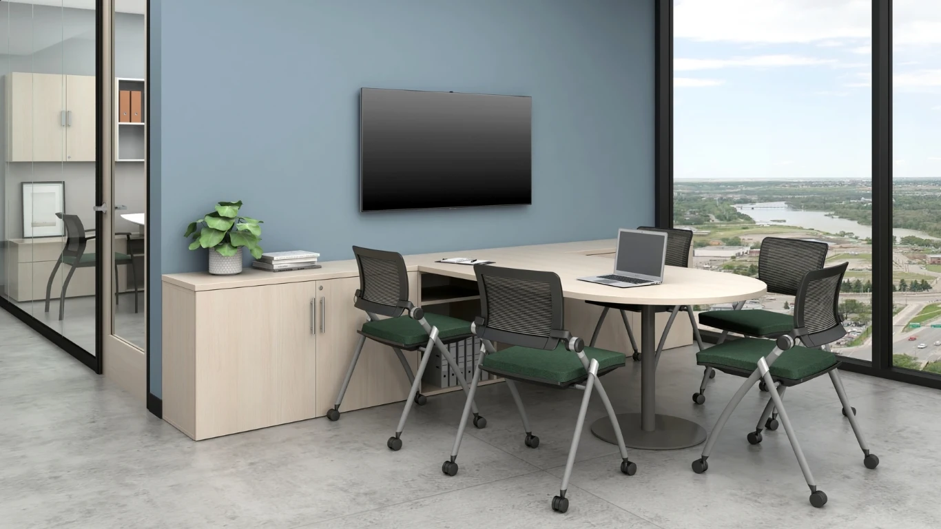 Complete your conference room with coordinated storage pieces like credenzas, presentation cabinets, or wall-mounted media centers. These additions help you keep supplies, presentation tools, and tech equipment organized and out of sight—so your room stays clean and ready for business.