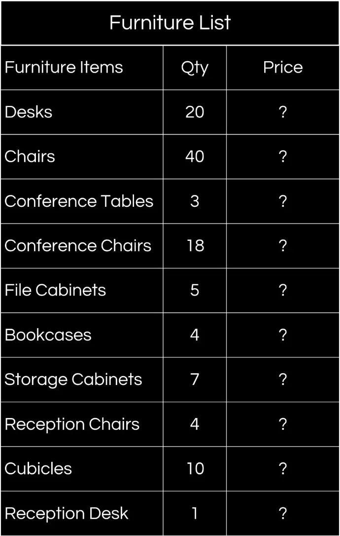 Let us know what furniture you need to rent and in which quantities, desks, chairs, conference tables, and more. If you have a list even better, share that with us and we'll get right on it.